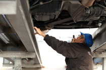 Todos os nossos veículos são verificados em rampas para verificar se há ferrugem, corrosão,problemas nas articulações e qualquer vazamento de água, óleo ou combustível. Nossas rampas estão equipadas com iluminação especialmente projetada para ver qualquer problema.